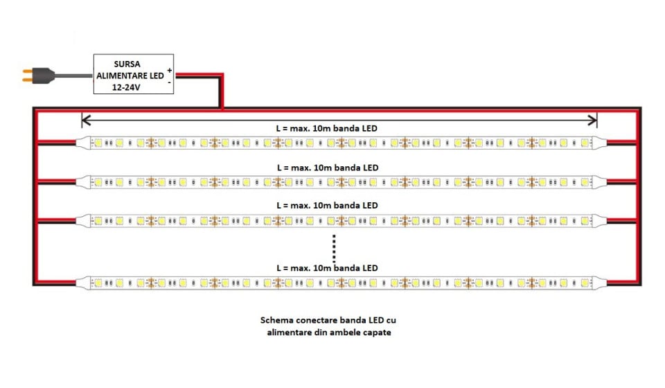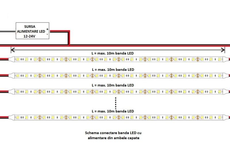• Alimentarea se face la 24V, deci este necesară alegerea unei surse de alimentare în funcție de puterea consumată a benzii LED. Este recomandat să se folosească aproximativ 80% din puterea sursei de alimentare. De exemplu, pentru o lungime de 5m de bandă LED, ce are o putere totală de 80W, se recomandă o sursa de alimentare de 100W.
